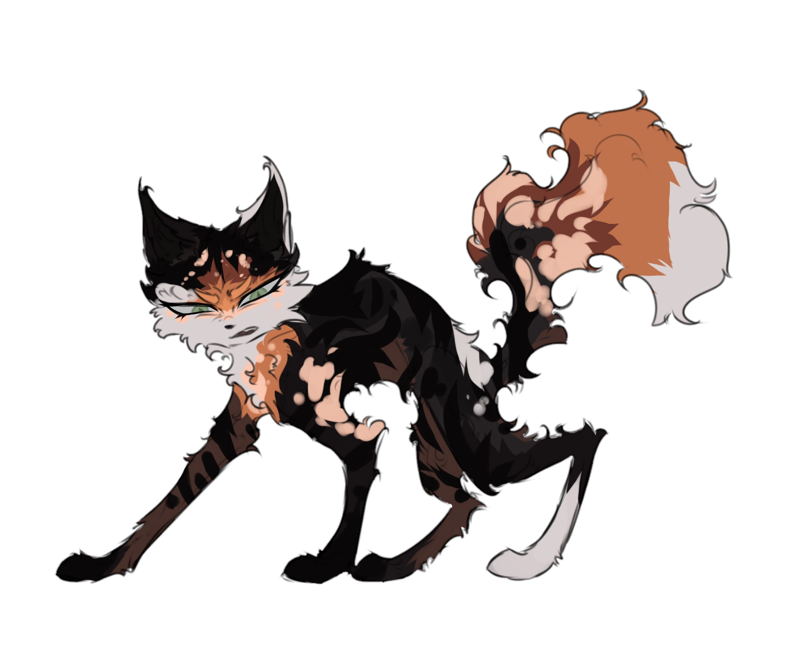 - Forestdawn is a lean[7] and slender[6], brown, black, ginger and white[8] tortoiseshell tabby she-cat[1] distinguished by a striking flame-coloured patch on her face[9] that resembles a maple leaf[10], with additional markings on her chest[11] and tail[10]. She has a white ear[5], muzzle, and tail tip, along with some spots near her right eye[4] and flank[1]. Peach-coloured dapples adorn her shoulders[4], forehead[2], and slightly bushy tail[10]. She has a black nose[12], mottled pink-and-black paw pads[10], and dark inner ears[11], and her narrow[6] grey-green eyes[13] are marked by slit-like pupils[14].