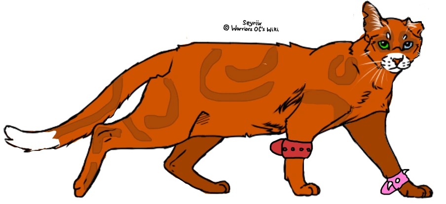 Minnow is a dark ginger tom with darker swirls, a torn ear, a white tail tip and a pink bloodclan collar wrapped on his leg.