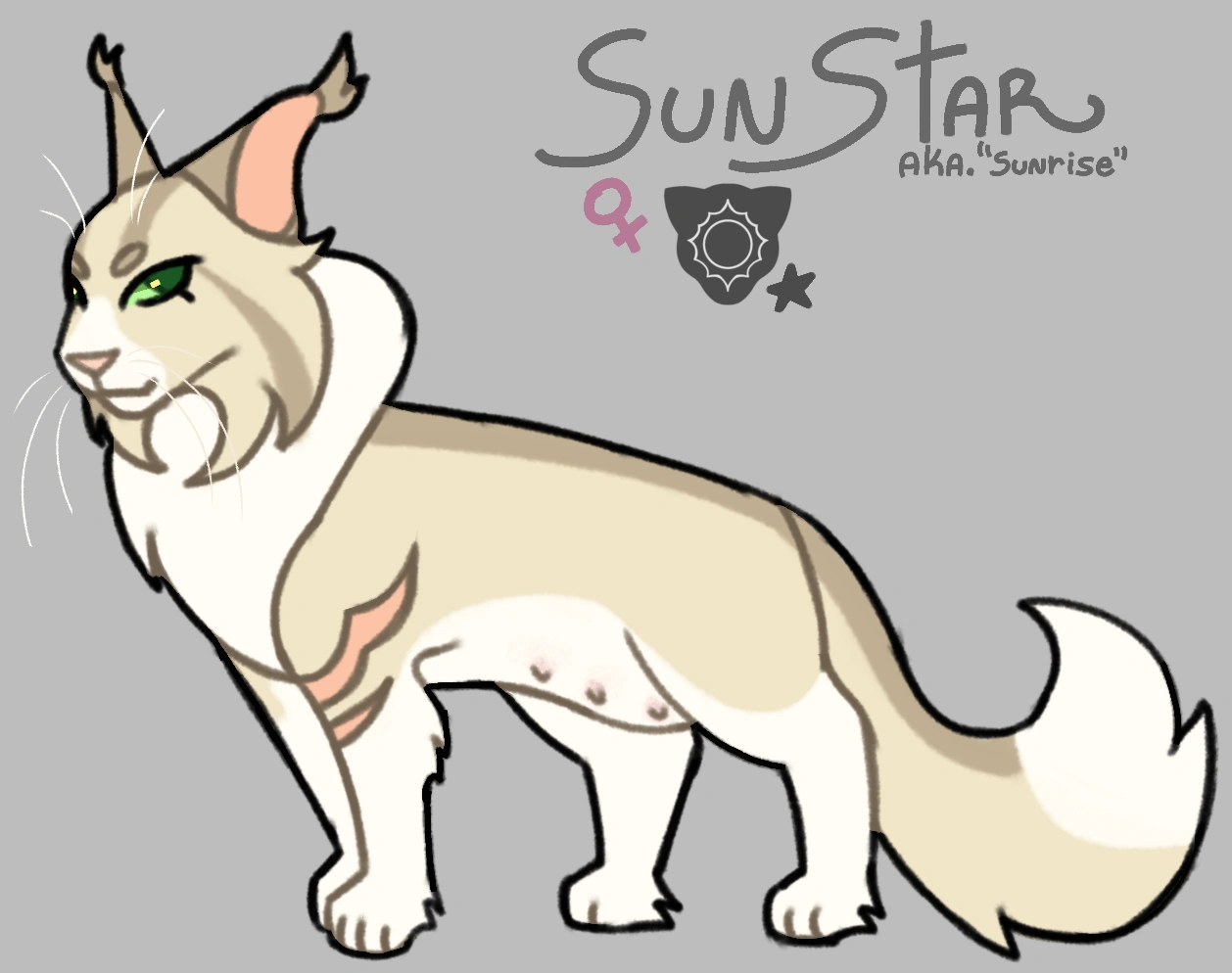 Sunstar, formerly known as Sunrise, is a light cream and white she-cat with long silky fur and determined green eyes.