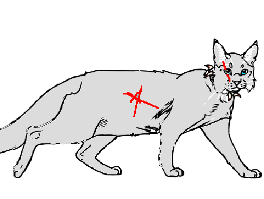 Tornclaw is a huge light grey tom with ocean blue eyes. He has many scars.